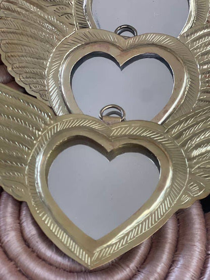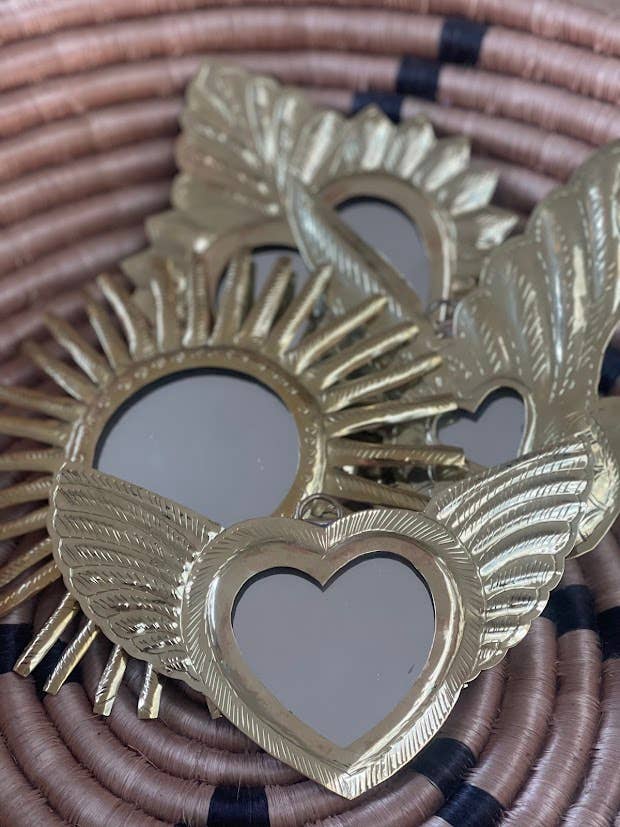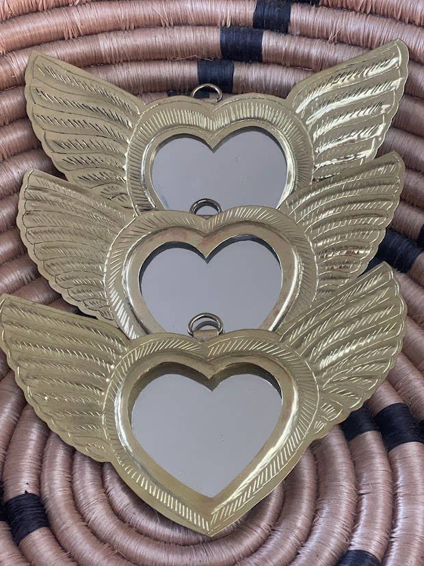 Ce magnifique miroir en laiton en forme de cœur ailé est fabriqué à la main par des artisans qualifiés au Maroc. Avec une finition dorée scintillante et un diamètre de 15 cm, il ajoute une touche radieuse à n'importe quel espace. Chaque miroir est unique, ce qui le rend encore plus spécial.