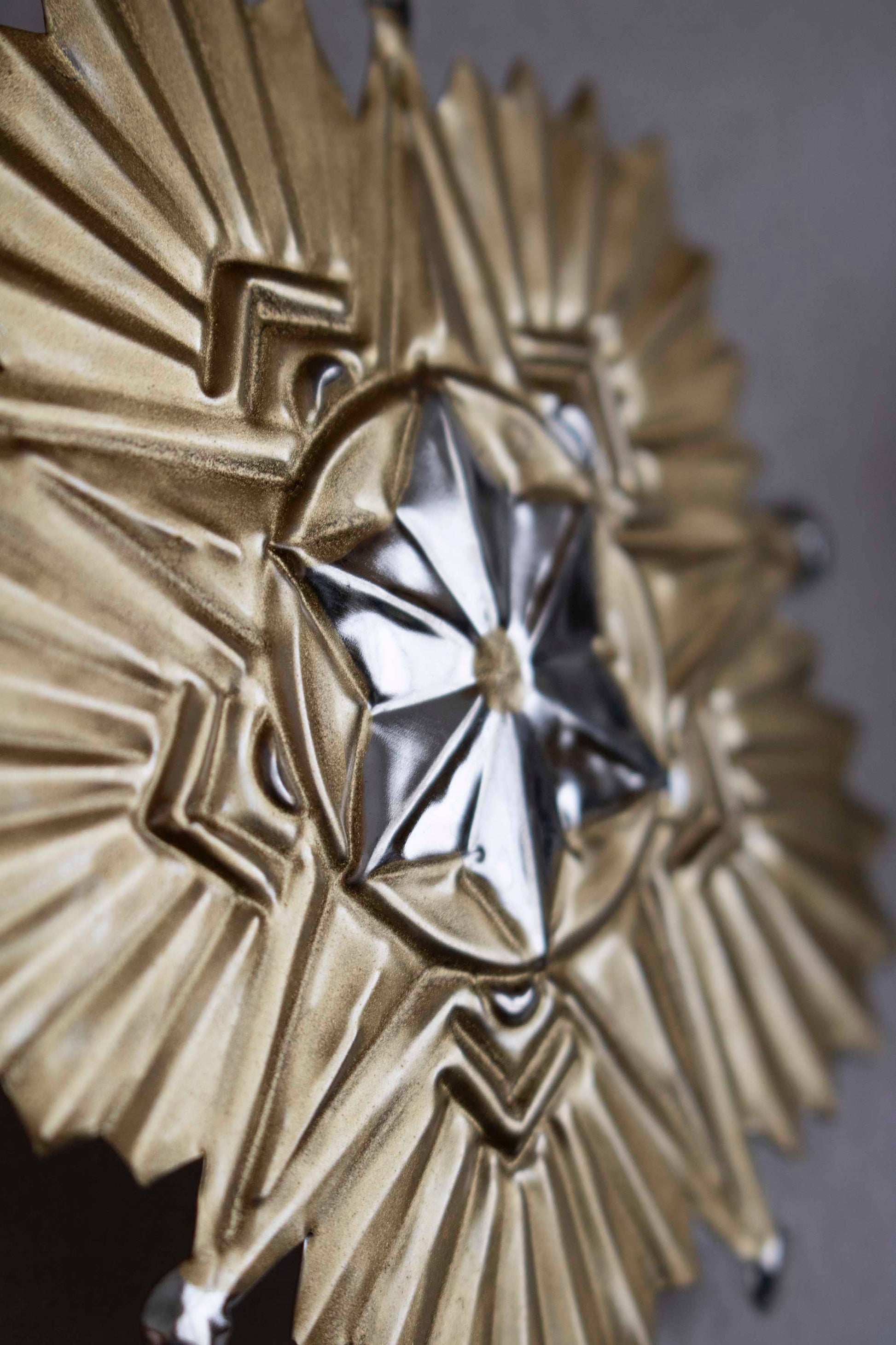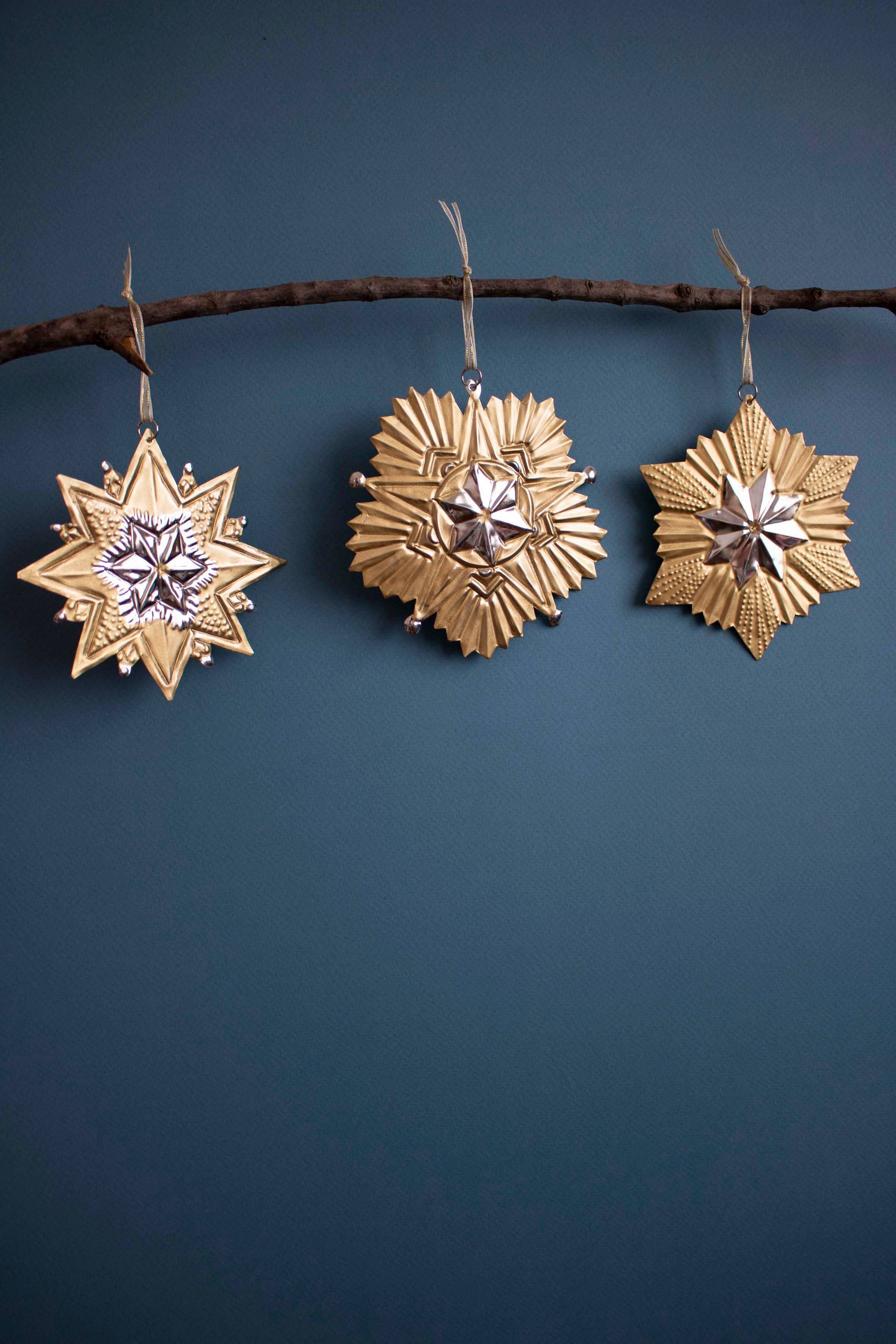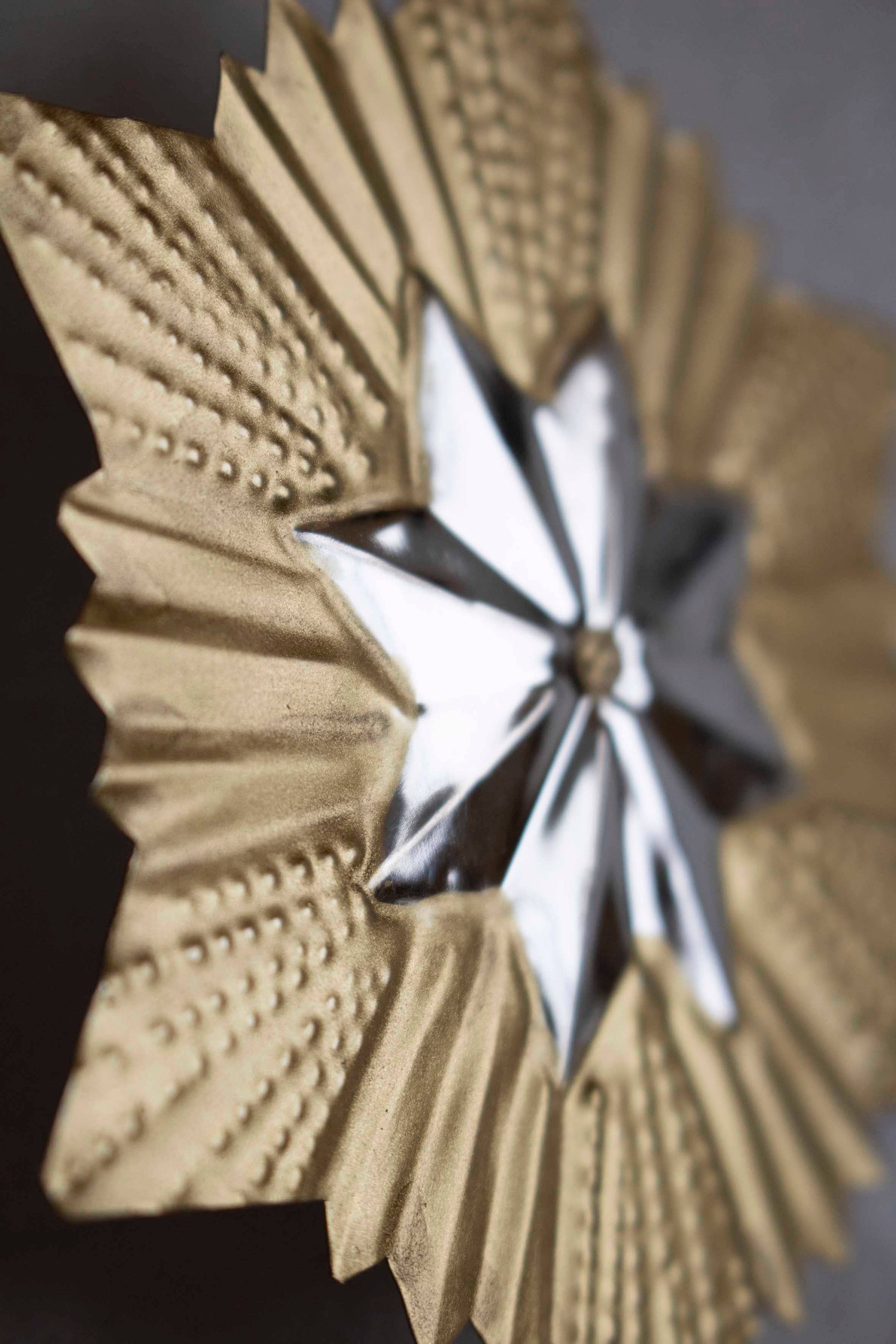 Ces étoiles bicolores - dorés et argentés - sont découpées et embossés à la main par des maîtres artisans à Oaxaca, au Mexique.