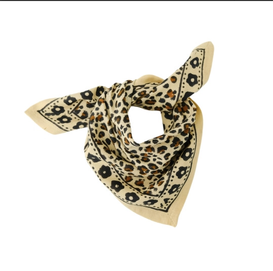 L'imprimé léopard se marie parfaitement avec notre iconique fleur, ajoutant une singularité à ce foulard.