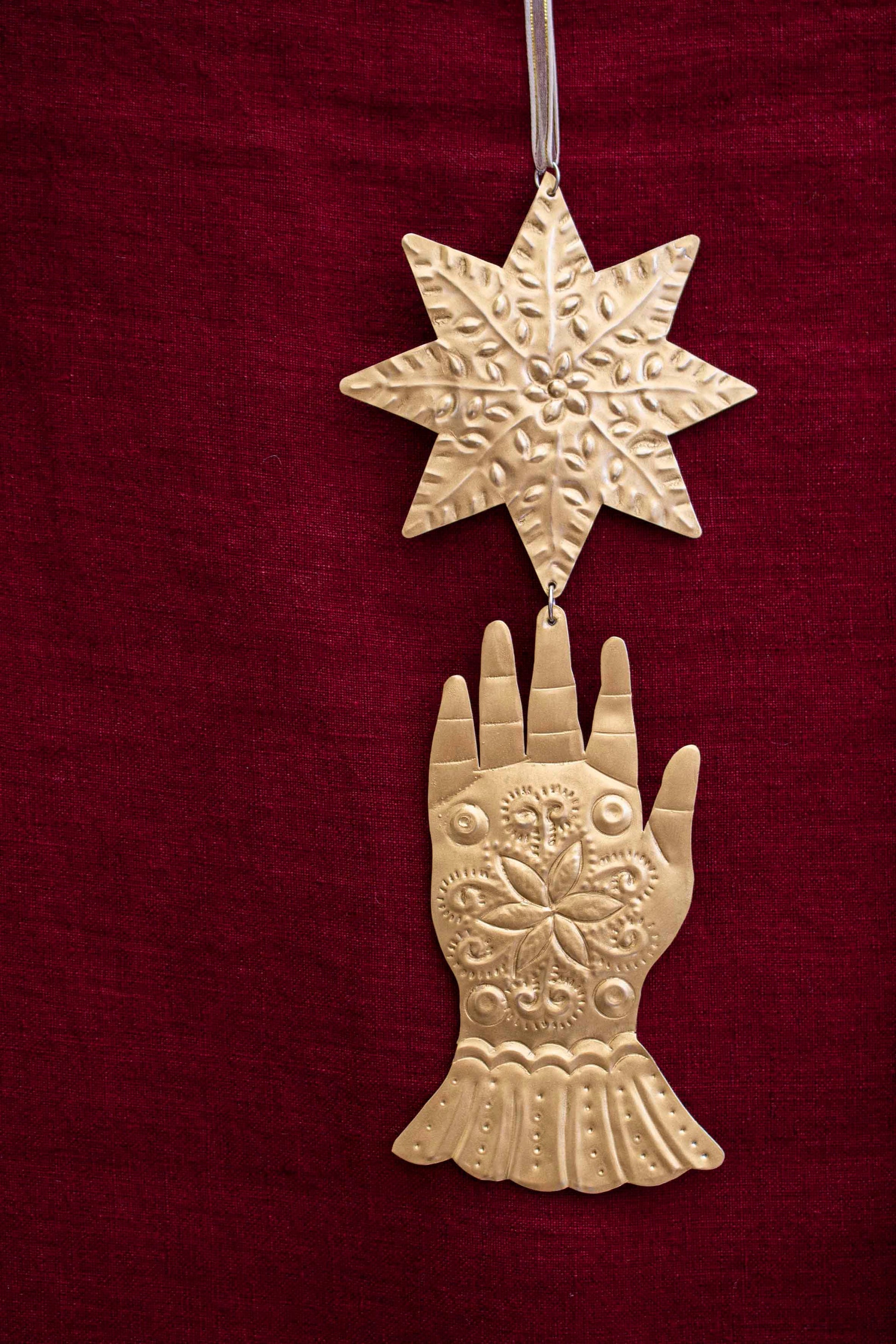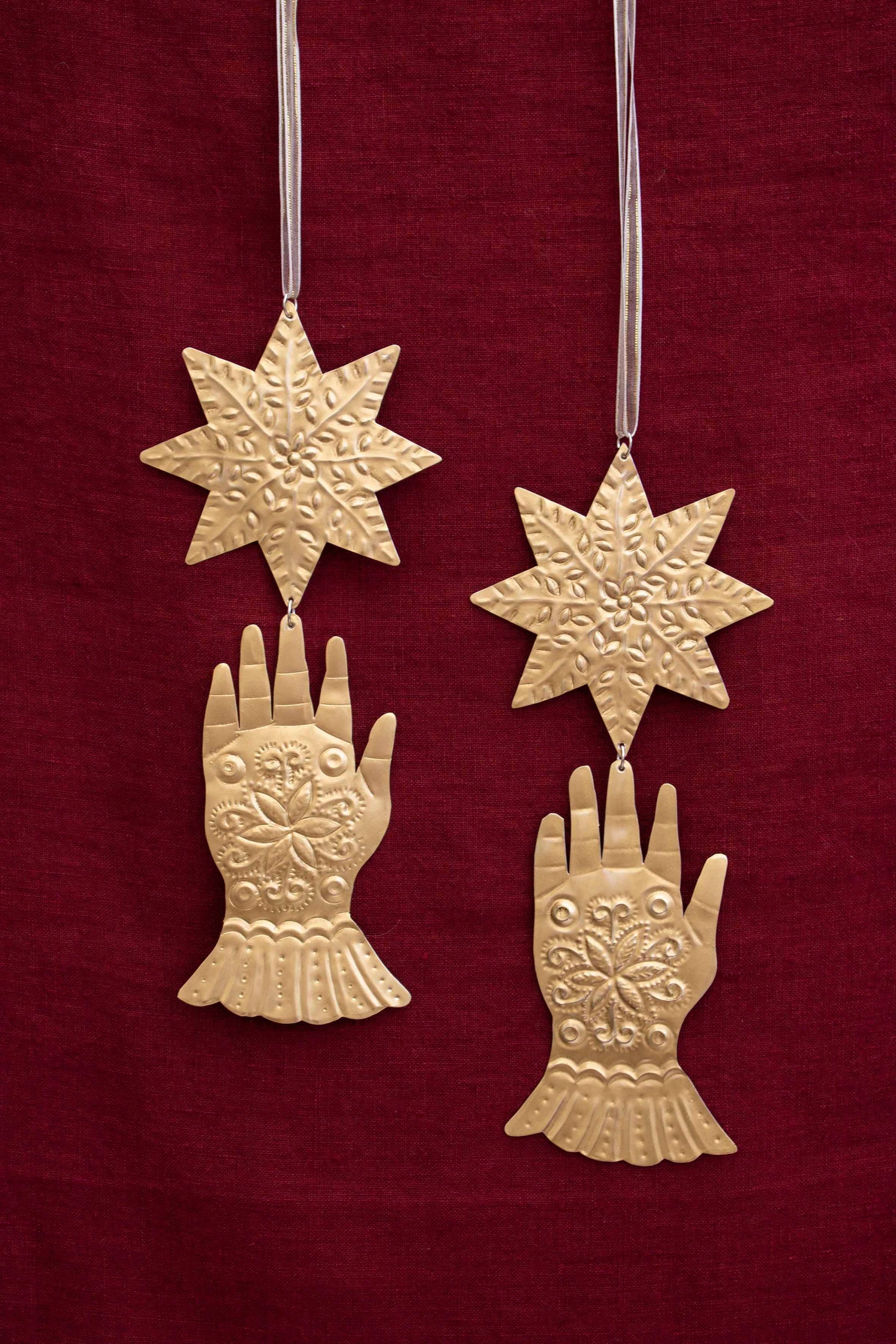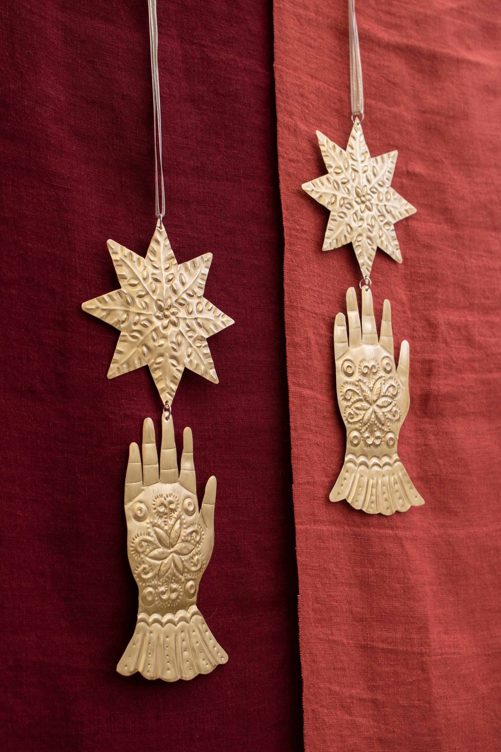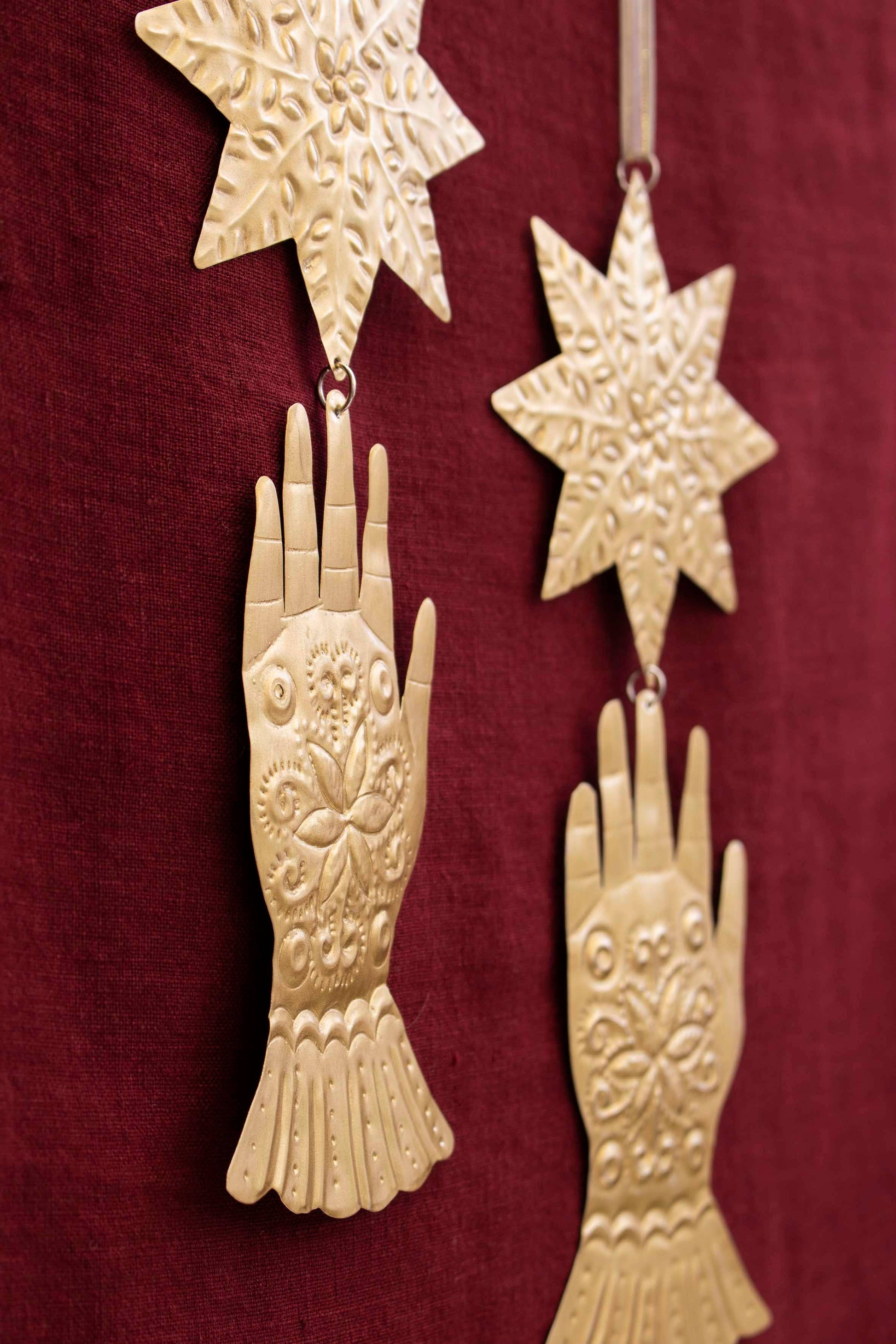 Ces mains sacrées dorées sont coupées et embossées à la main par des maîtres artisans à Oaxaca, au Mexique.