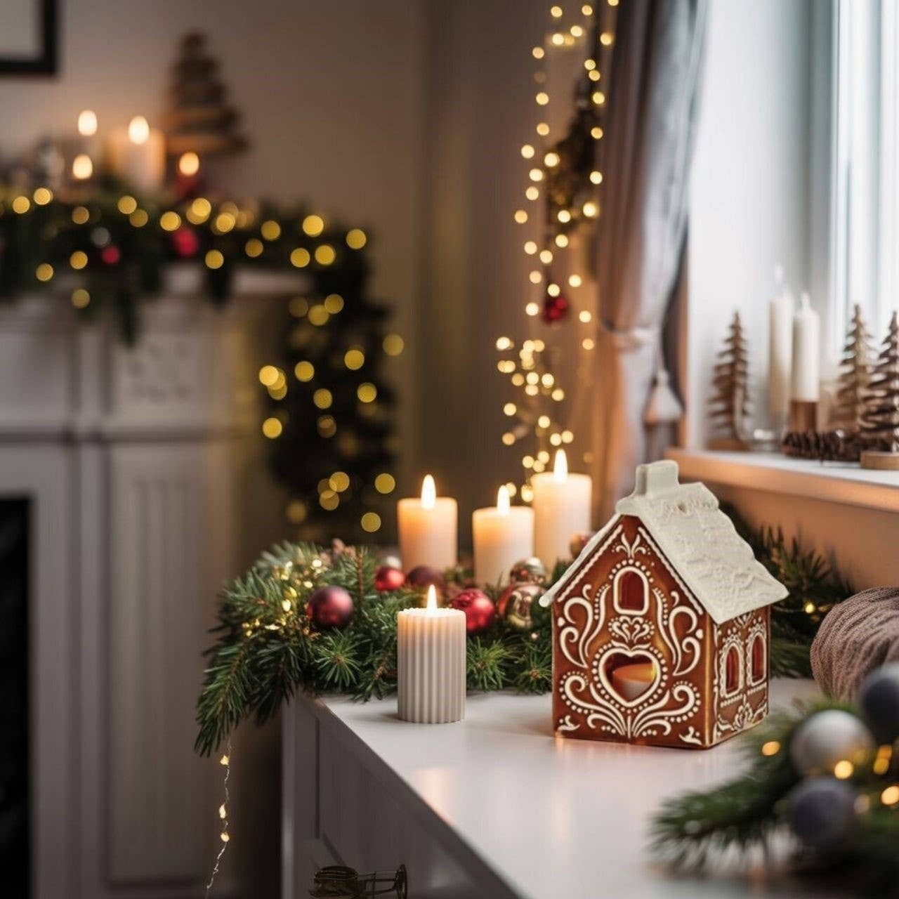 Maison en porcelaine en forme de bougie chauffe-plat LED pain d'épices, 2 pièces, marron/blanc (L/H/P) 8x9x6cm