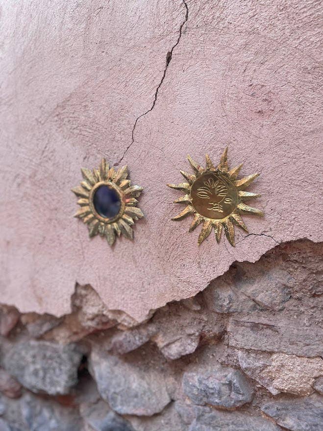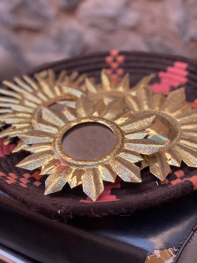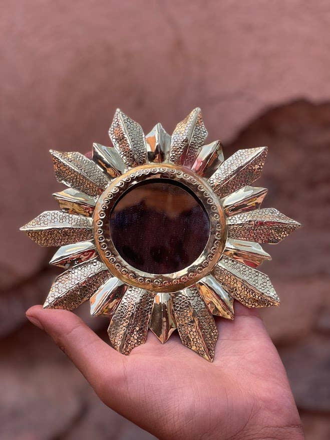 Chaque pièce est unique, ce qui la rend encore plus spéciale. Avec un diamètre moyen de 13 cm et une couleur dorée chatoyante, ce miroir ajoute un élément rayonnant à n'importe quel espace.