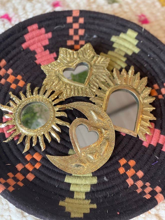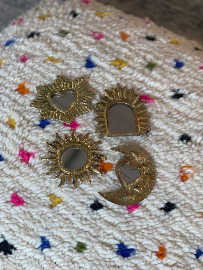 Miroir lune en laiton de différentes formes (Sweet Moon) fabriqués à la main par des artisans au Maroc. Accrochez-les en groupe ou combinez-les avec nos autres miroirs en laiton ou notre décoration murale. Les miroirs sont fabriqués à la main par nos artisans. Par conséquent, de petites imperfections peuvent être visibles sur le produit. Cela rend chaque article unique. De plus, en achetant ce produit, vous soutenez les artisans locaux talentueux avec lesquels nous travaillons.